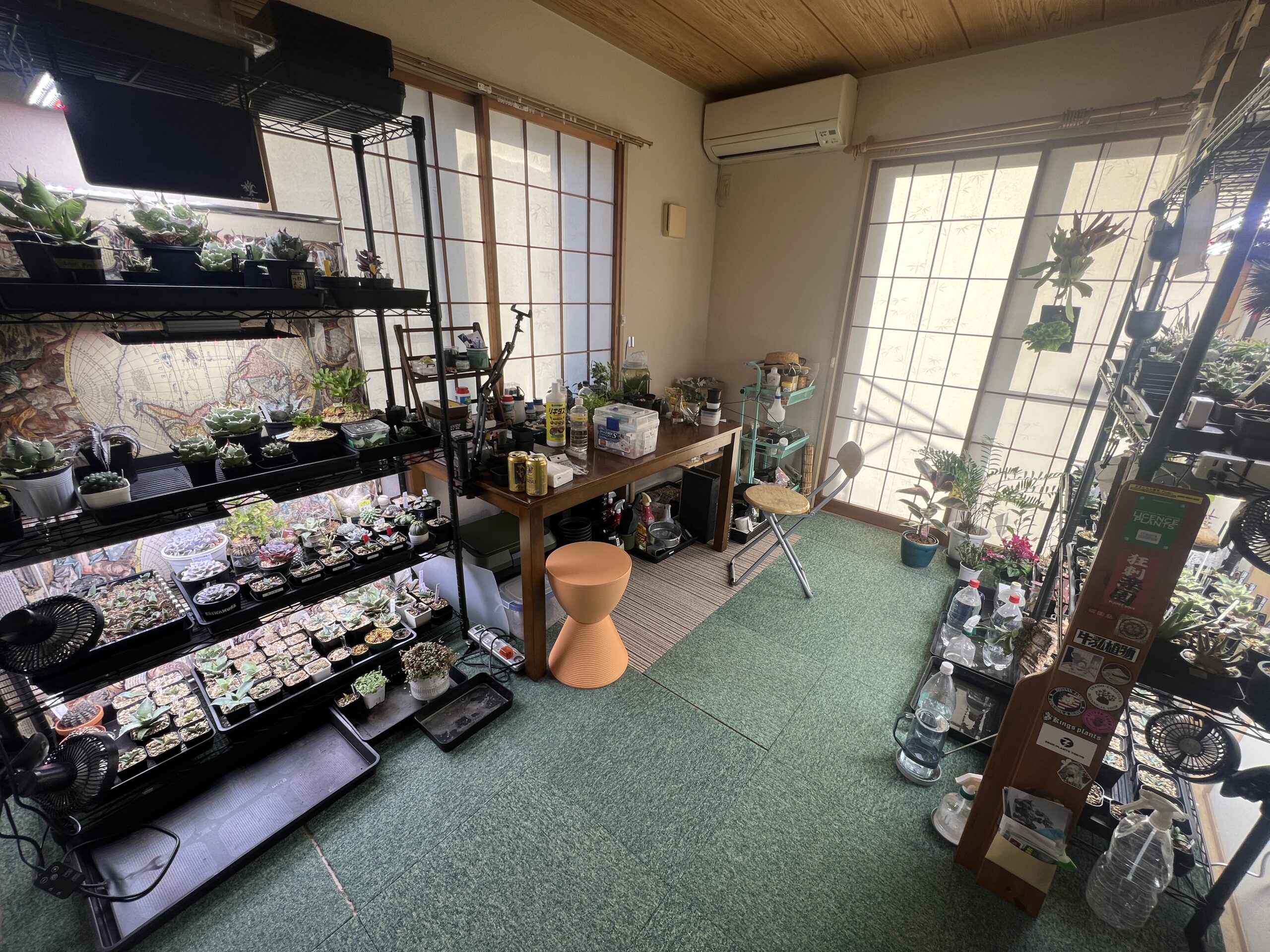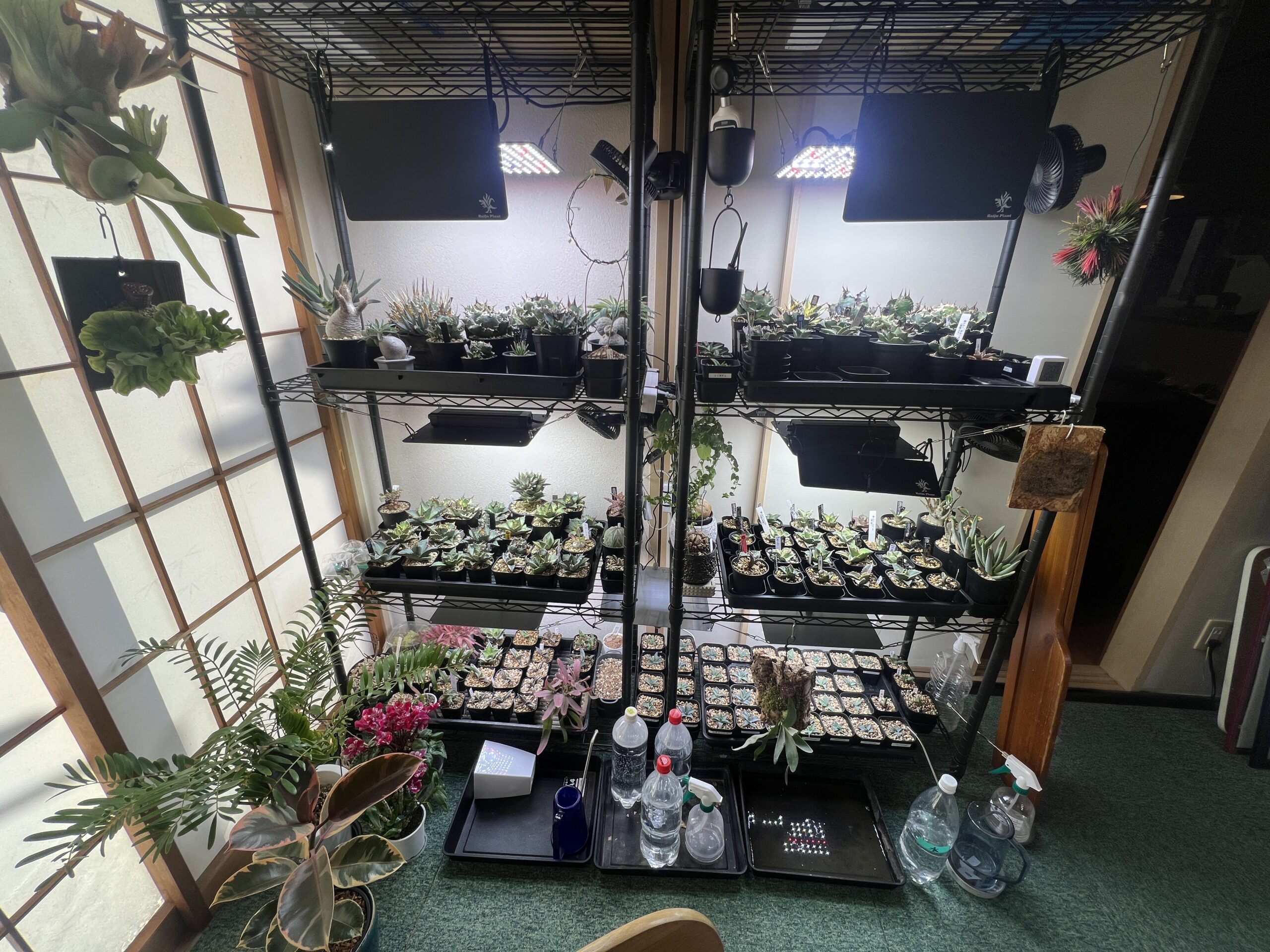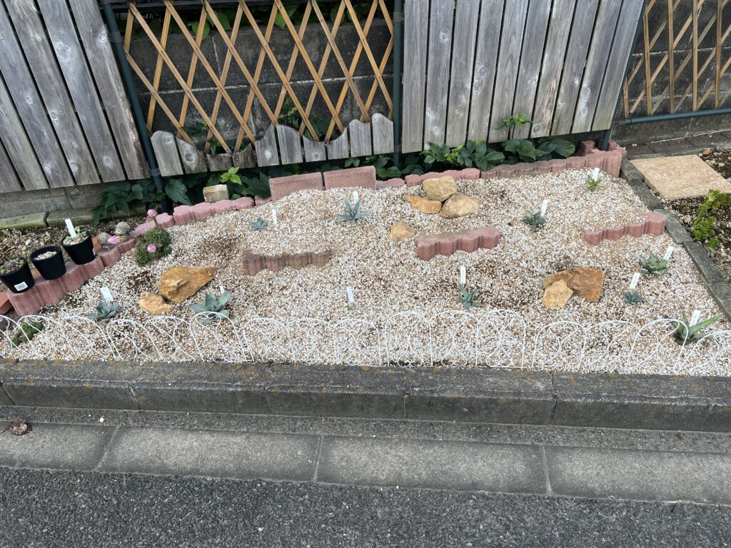 株がみるみる増えてゆき室内管理の置き場問題が発生し、植物育成用の棚を5台導入。植物育成用のLEDパネルライトを16台導入し、植物育成用LEDスポットライトは6台導入した。和室を植物専用部屋にした。また室外管理としては、歩道に面する庭には軽石と赤玉土を表土にして、みかも石を配置しアガベ用のドライガーデンを作ってみた。