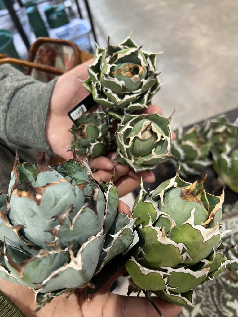 そうして近所の園芸店巡りがはかどる日々が始まる。Flower Village、タナベフラワー、奇妙な植物園、プロトリーフ、そして念願のシマムラ園芸やmana’s farmにまで遠征をすることになった。近所のホームセンターのパトロールもかかさない日々が続く。そんな毎日が充実している。今まで植物に碌に水などやったこともなかったのに、水をあげて心が整っていくのを感じたり。少しずつ成長するアガベたちをみて幸せを感じる。何より妻と同じ趣味ができたのも大きい。夫婦でアガベをみては、この鋸歯のこの感じがいいねと店頭で話していると、近くの客に夫婦でそういう話ができるっていいですねと言われたり、店の人にも、自分もそういうパートナーを探したいと言われたりで、わりと夫婦で共通の趣味というのはレアなケースなのかなと思う今日この頃である。ただ弊害としては、歯止めが利かない!