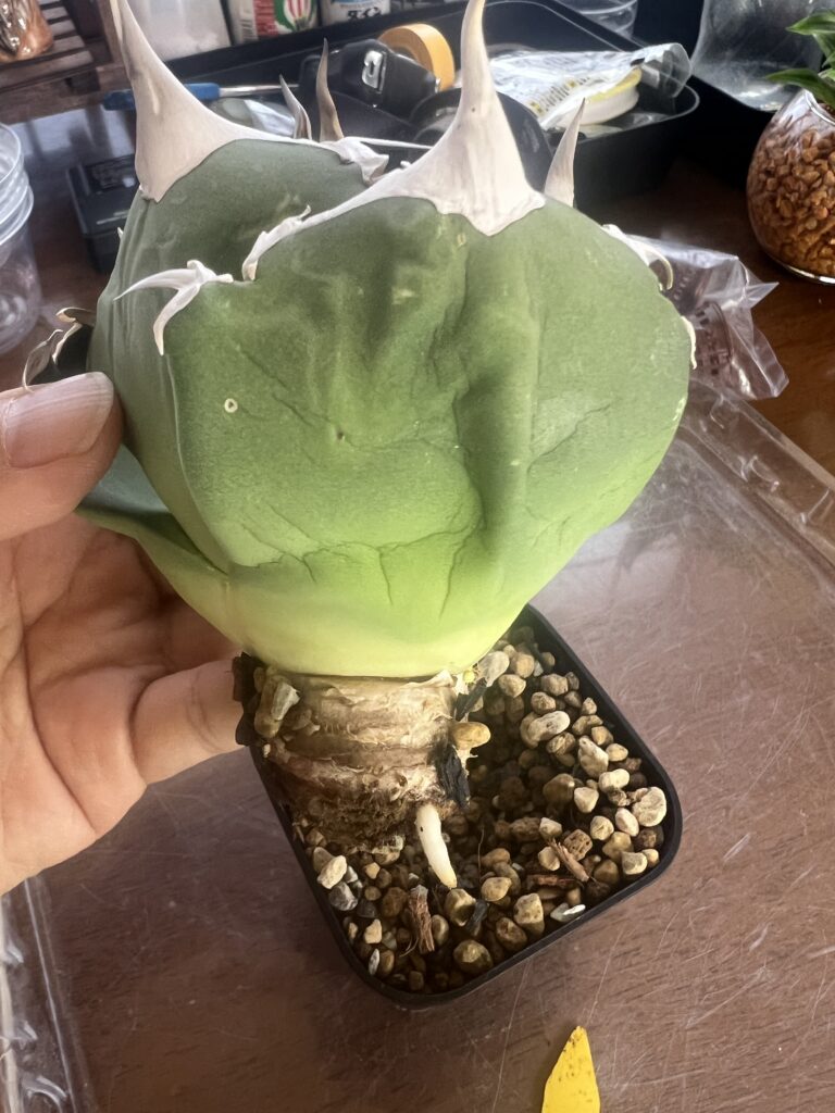 この白銀甲蟹というアガベがいわゆるベアルート株というもので、根が全て枯れているので、発根をさせなくてはならないという株であった。試行錯誤して発根管理をすること52日目にしてようやく根が出た。その感動は忘れられない。以降、発根管理にはまることになった。なんだかんだでかれこれ50株ほど発根管理で根を出させていたりする。根が出たときは「お根でとう!」「いい根!」などの業界用語があるのが面白い。